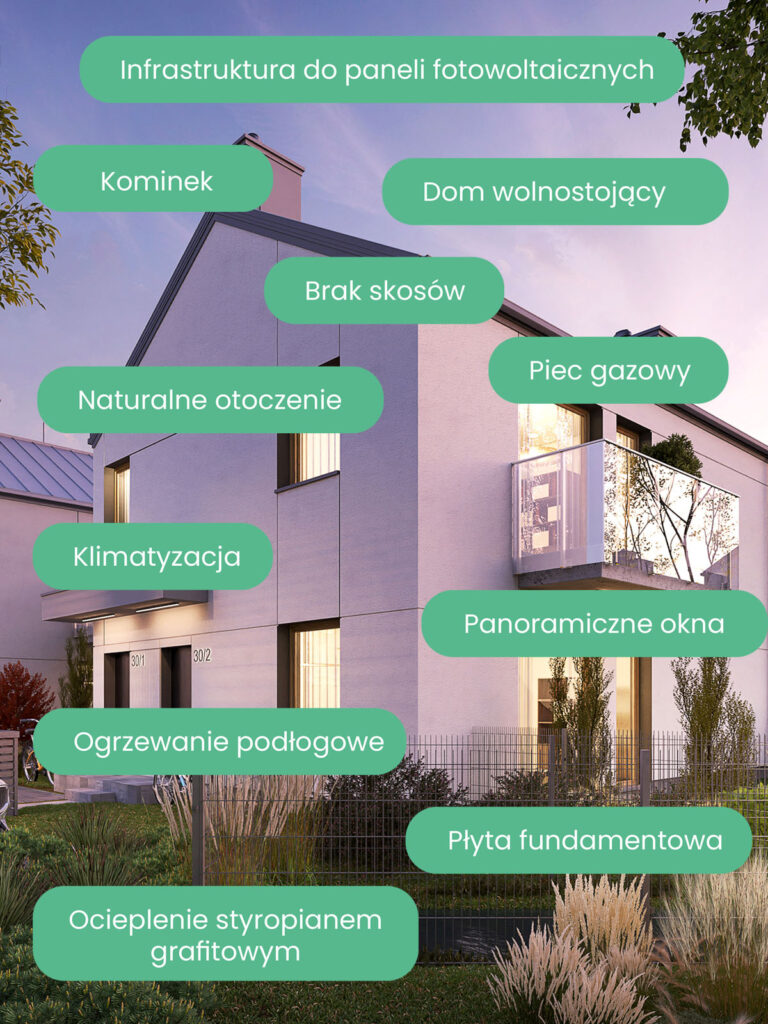 Każdy szczegół w tej inwestycji został starannie dopracowany. Domy wyposażone są w klimatyzację, ogrzewanie podłogowe i urokliwy kominek.